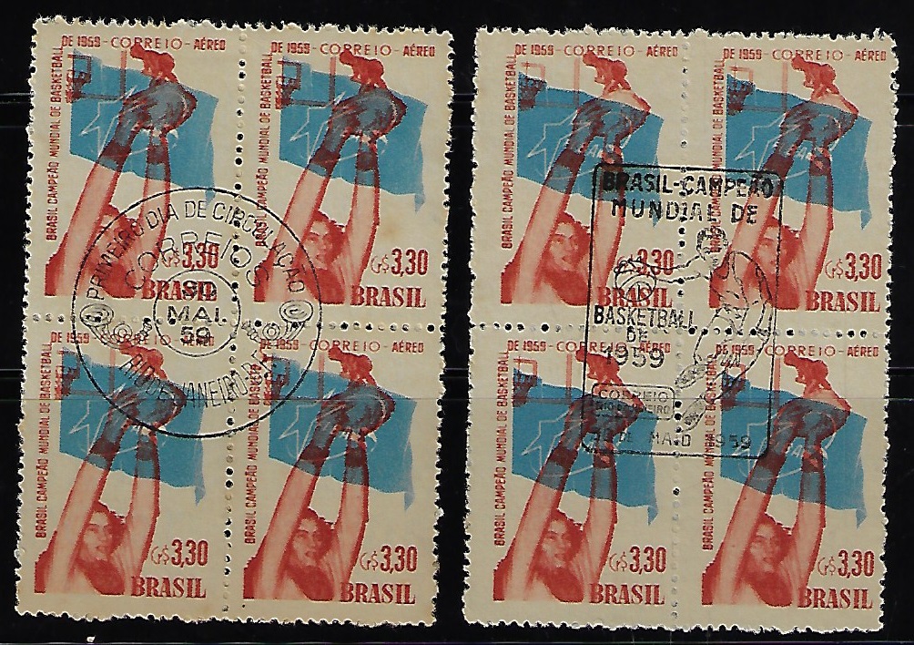 | 73224 | 87, Campeão Mundial de Basketball, quadras com carimbo comemorativo e de 1º dia de circulação | 10,00 | Foto |