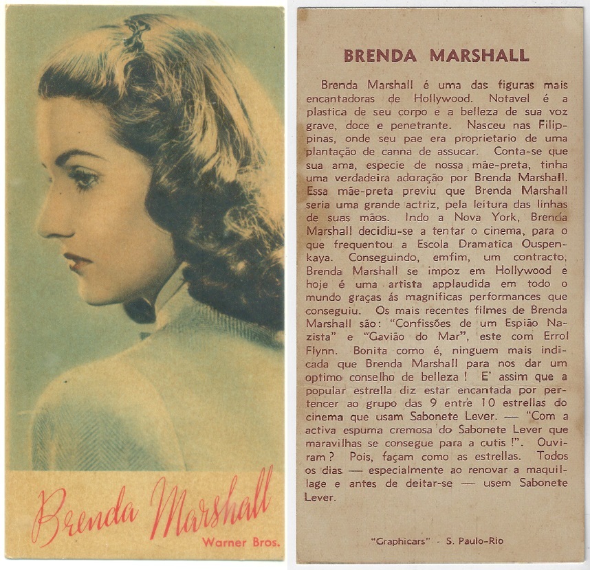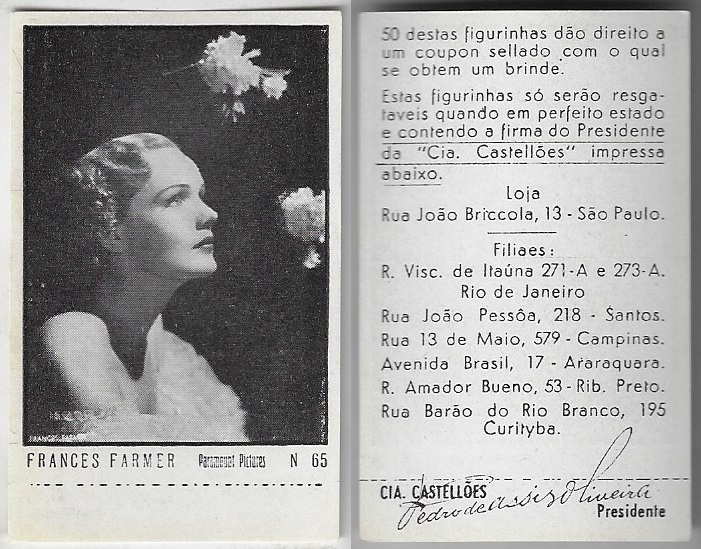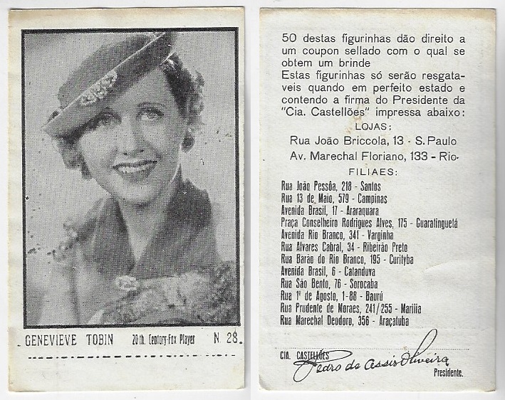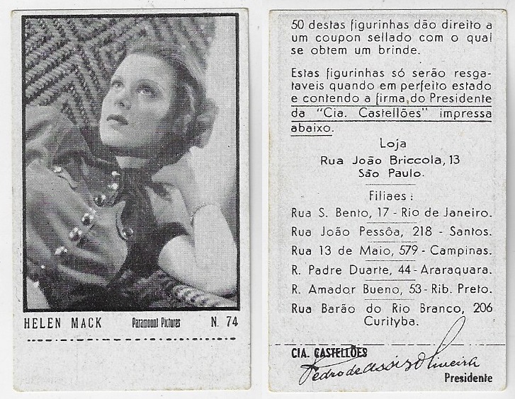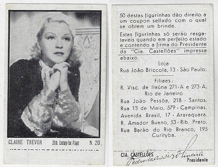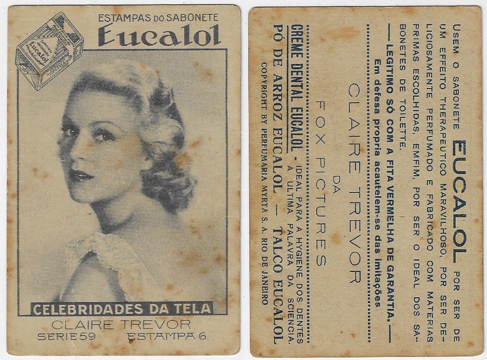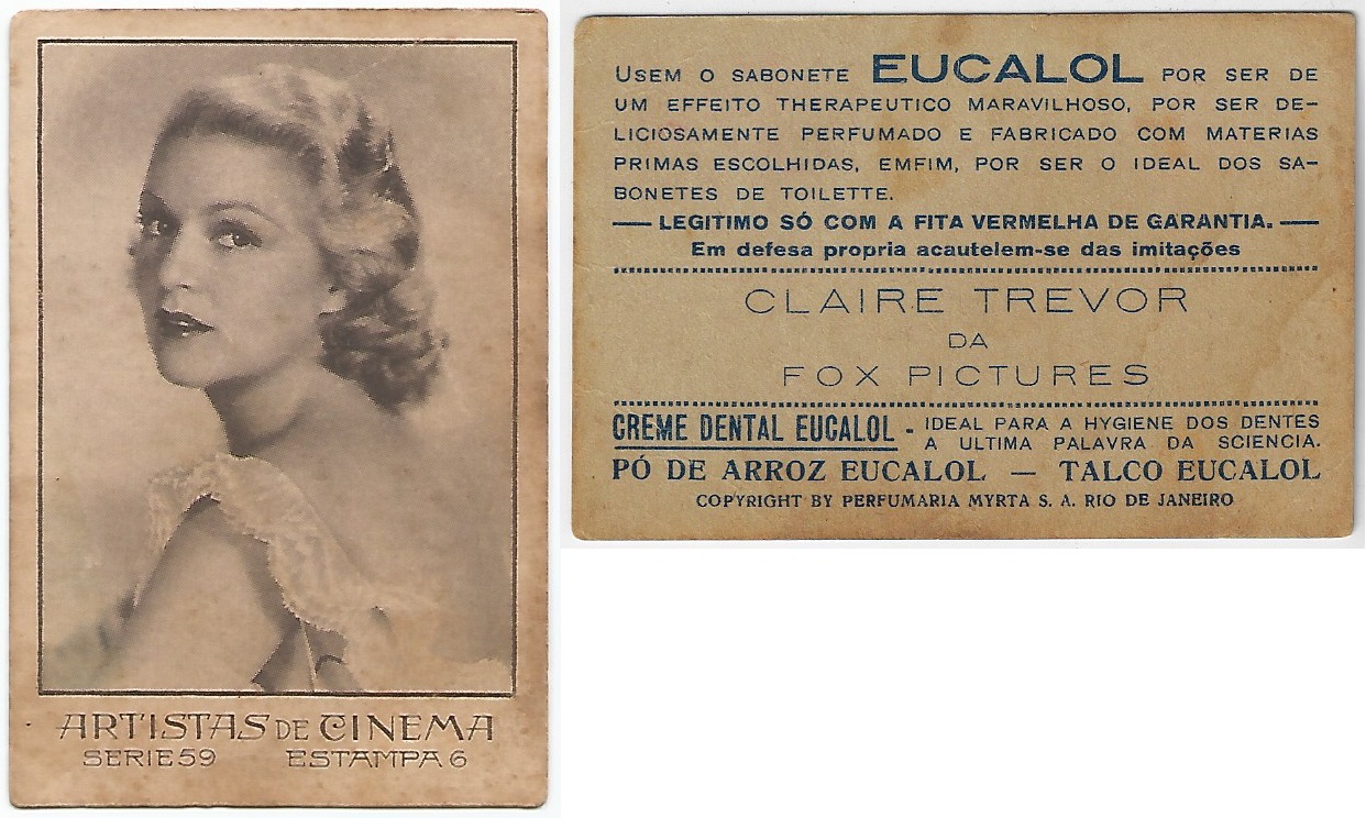 | 66107 | Brasil, 1930s, estampa Eucalol série 59, estampa 6, "Celebridades da Tela - Claire Trevor", verso "Usem..." | 25,00 | Foto |