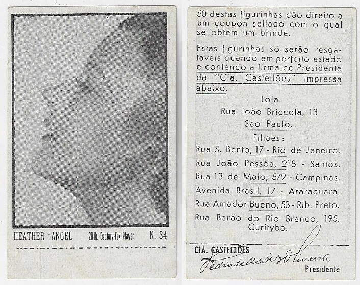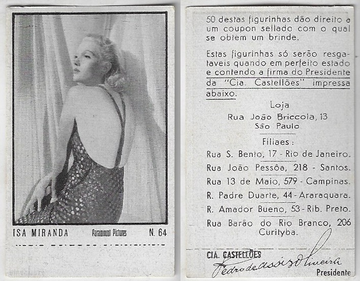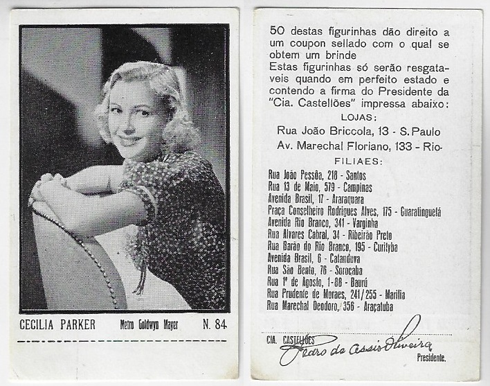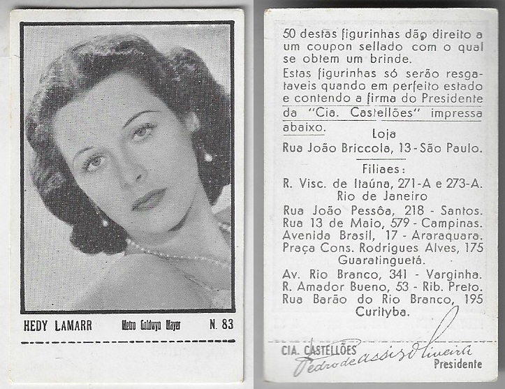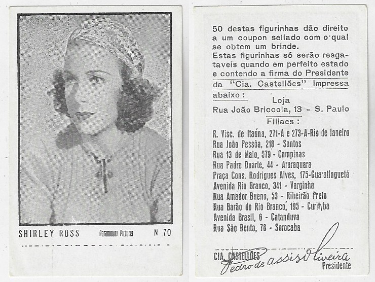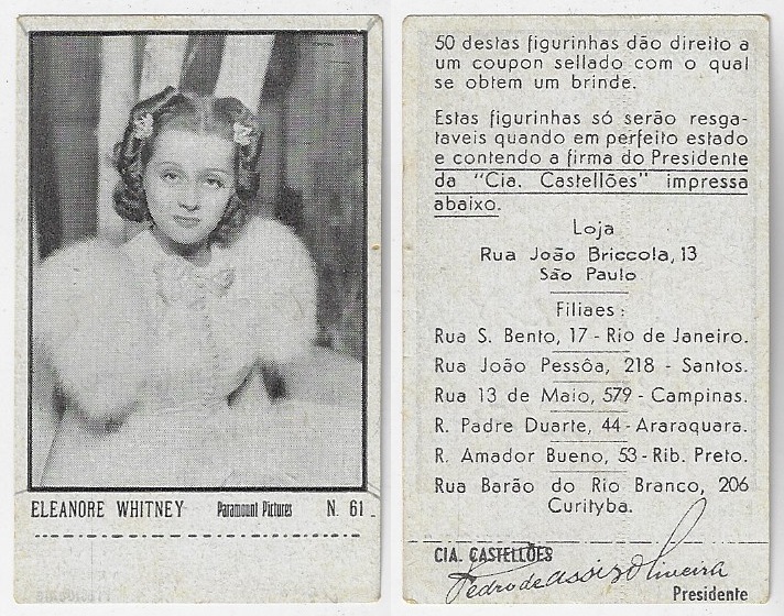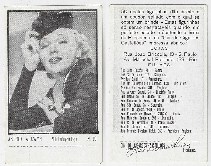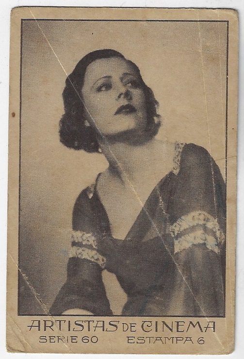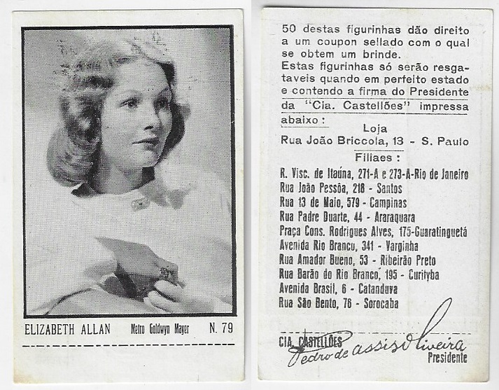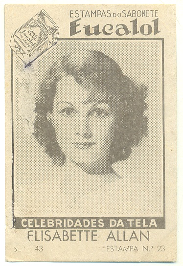 | 66083 | Brasil, 1930s, estampa Eucalol série 43, estampa 23, "Celebridades da Tela - Elisabette Allan", verso "Todos...", raspado frontal | 15,00 | Foto |