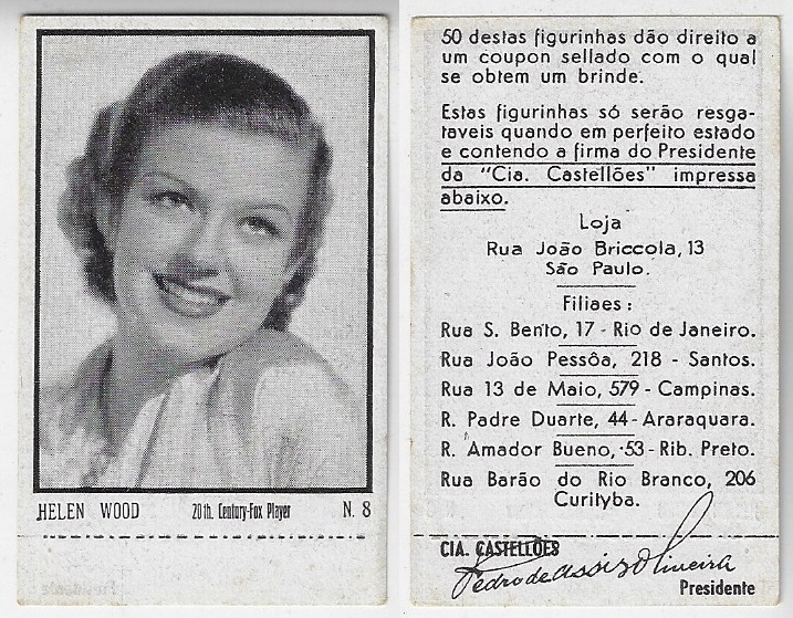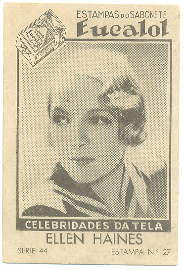 | 66087 | Brasil, 1930s, estampa Eucalol série 44, estampa 27, "Celebridades da Tela - Ellen Haines", verso "Todos...", 1 furo de cupim fechado | 15,00 | Foto |