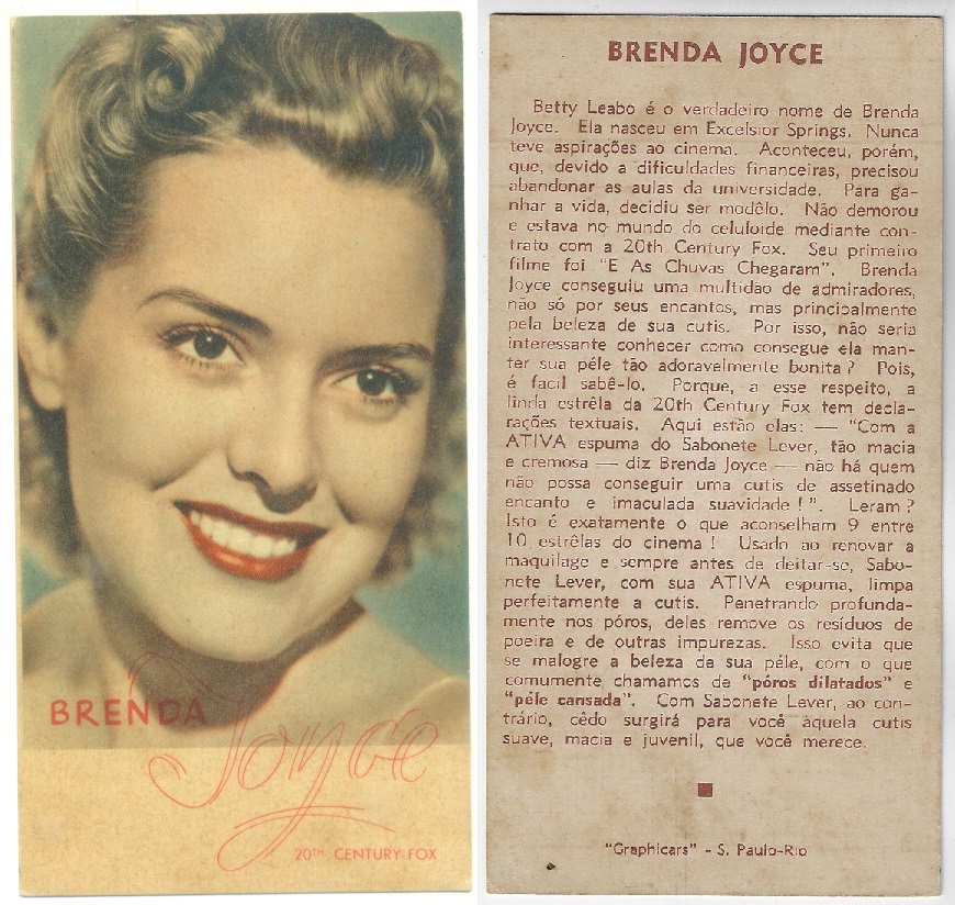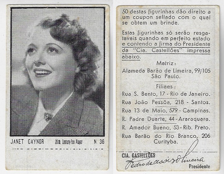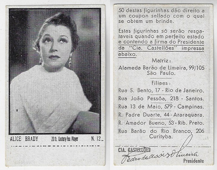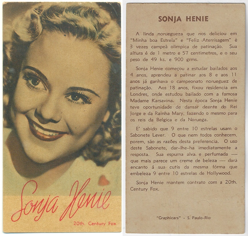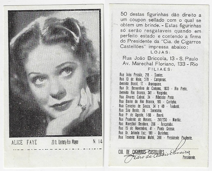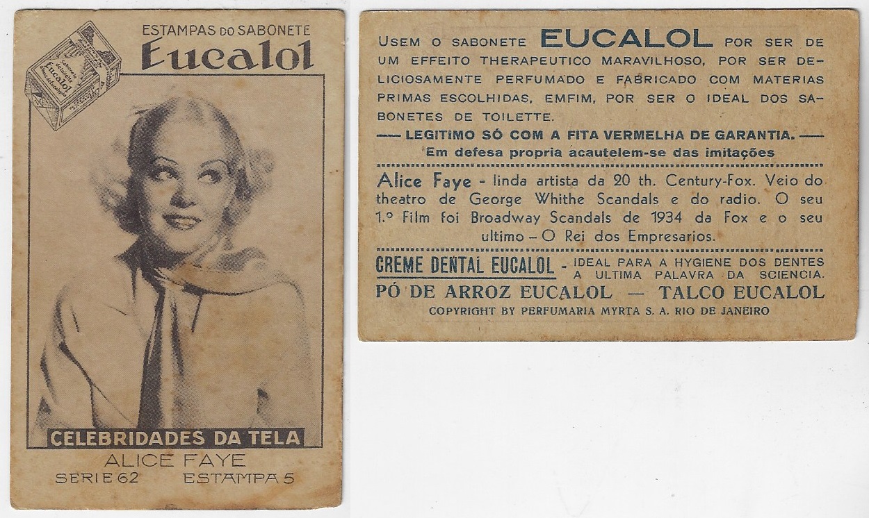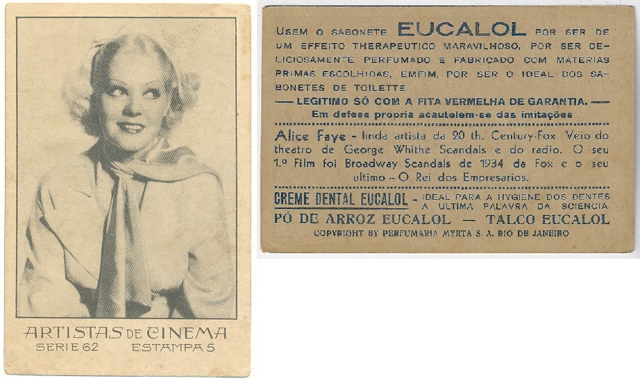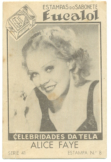 | 66124 | Brasil, 1930s, estampa Eucalol série 62, estampa 5, "Celebridades da Tela - Alice Faye", verso "Usem..." | 25,00 | Foto |
