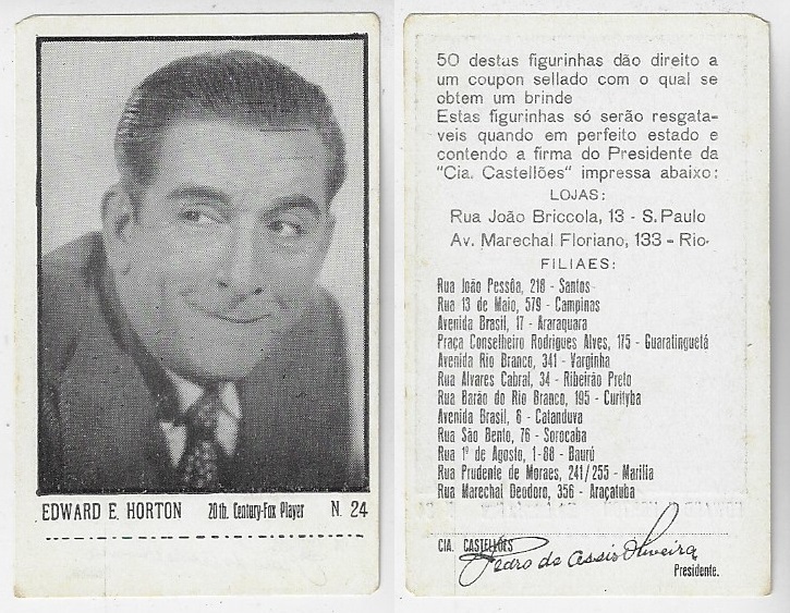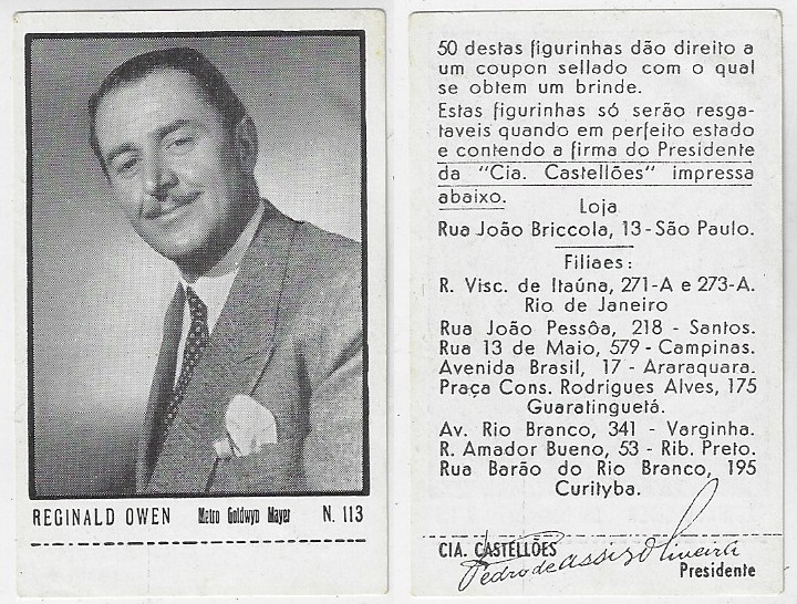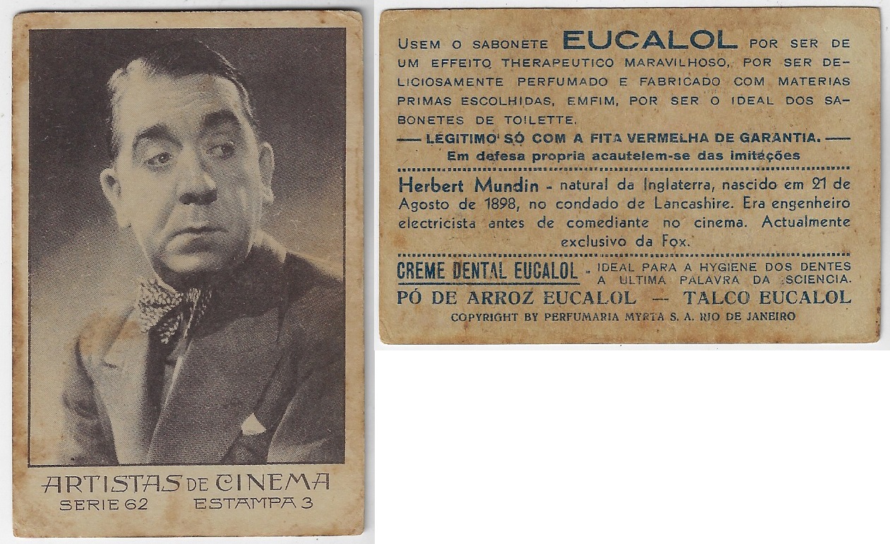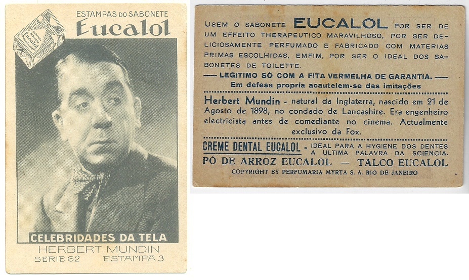 | 66122 | Brasil, 1930s, estampa Eucalol série 62, estampa 3, "Celebridades da Tela - Herbert Mundin", verso "Usem..." | 25,00 | Foto |