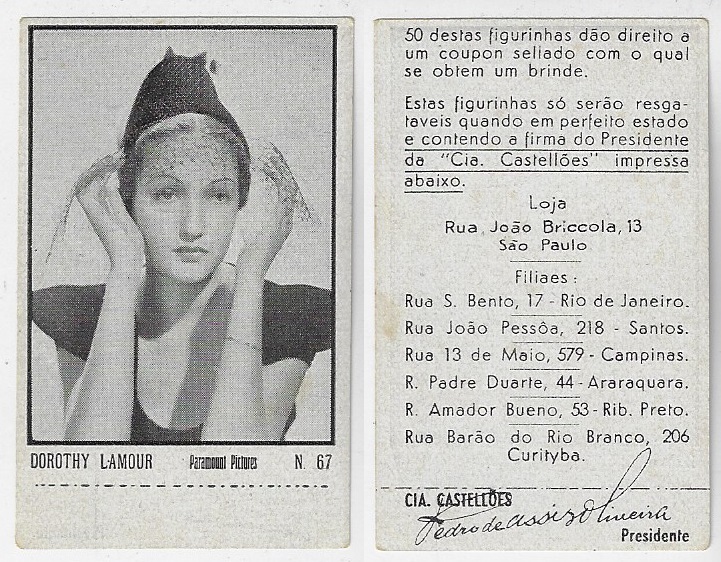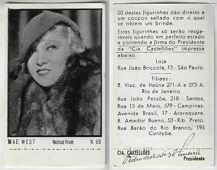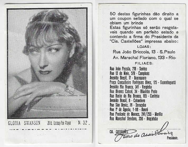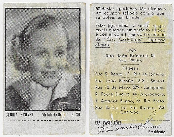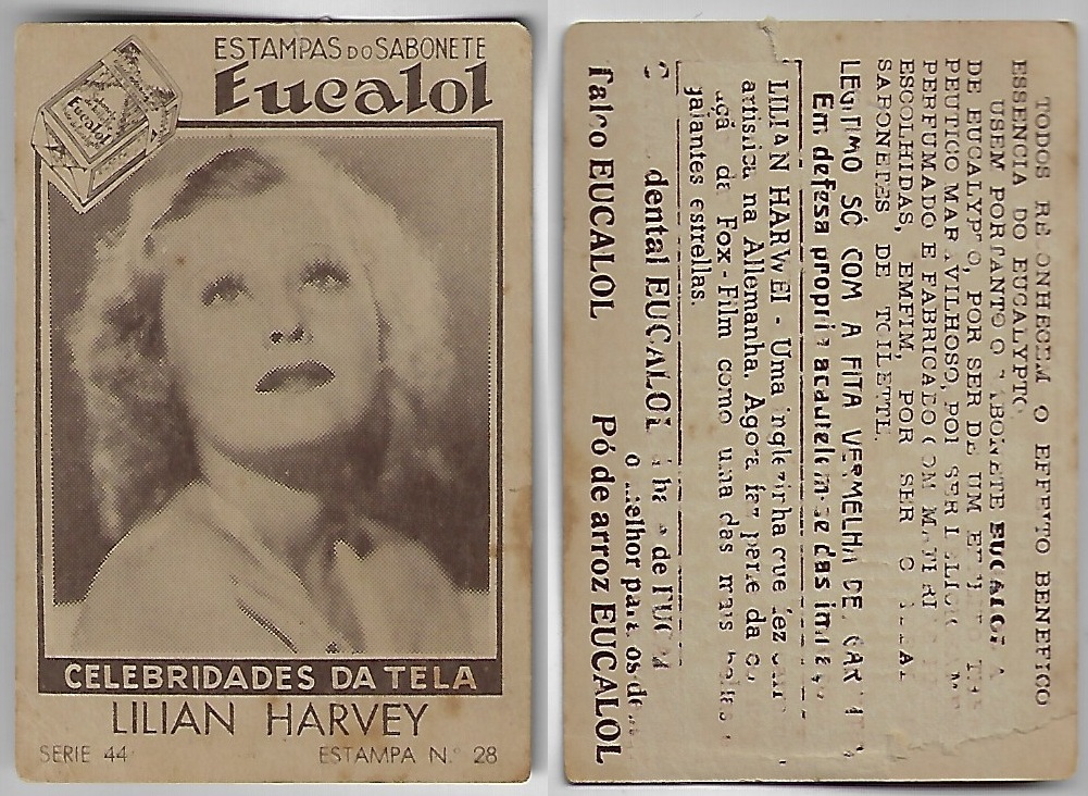 | 66088 | Brasil, 1930s, estampa Eucalol série 44, estampa 28, "Celebridades da Tela - Lilian Harwey", verso "Todos...", desgaste no verso, variante "Harvey" com "v" | 30,00 | Foto |