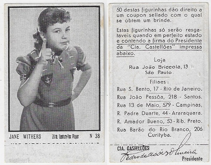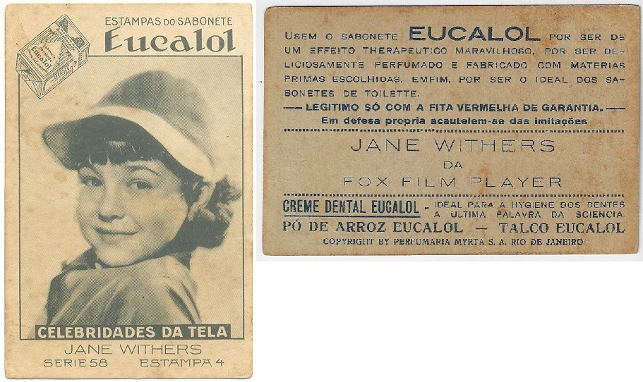 | 66100 | Brasil, 1930s, estampa Eucalol série 58, estampa 4, "Celebridades da Tela - Jane Withers", verso "Usem..." | 25,00 | Foto |