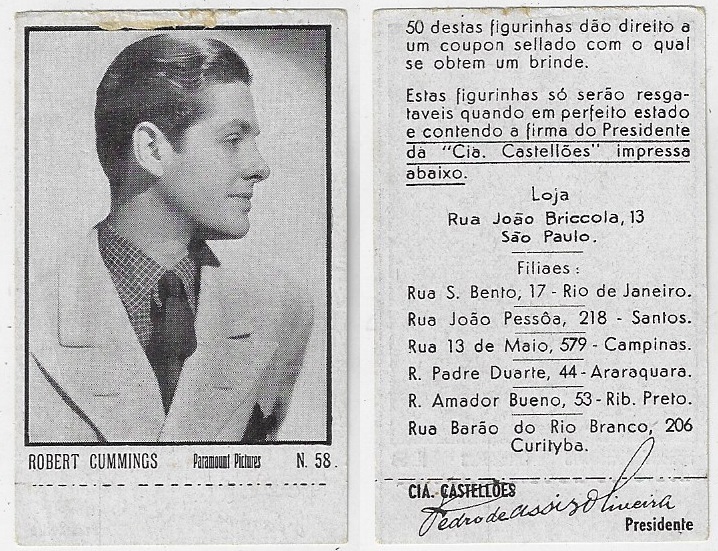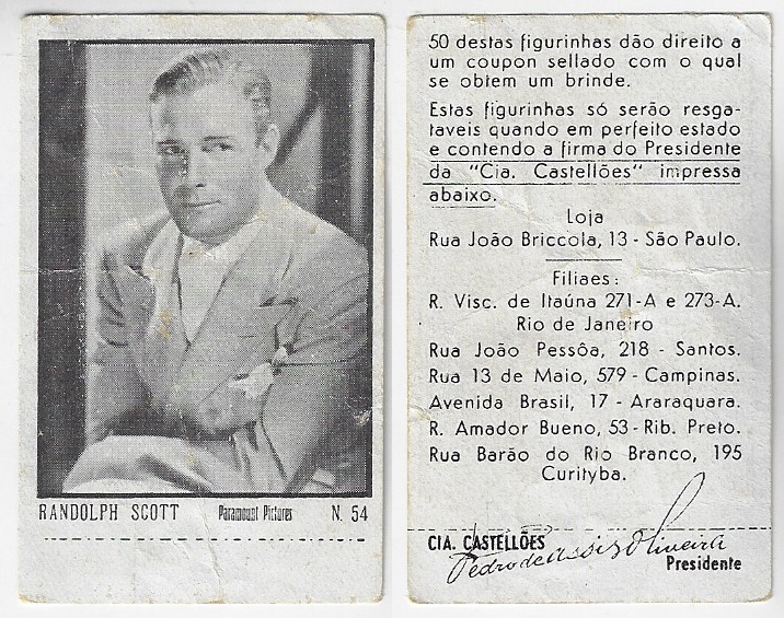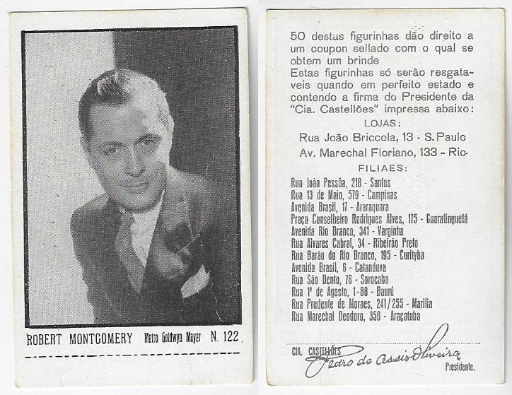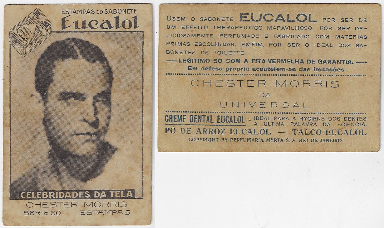 | 66112 | Brasil, 1930s, estampa Eucalol série 60, estampa 5, "Celebridades da Tela - Chester Morris", verso "Usem..." | 25,00 | Foto |