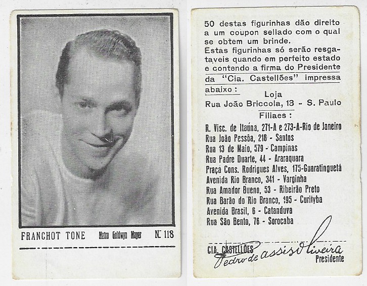 | 66065 | Brasil, 1930s, estampa Eucalol série 43, estampa 20, "Celebridades da Tela - Franchot Tone", verso "Todos..." | 25,00 | Foto |