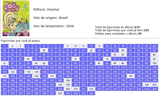 Estamos no site Troca Figurinhas com o login "mss1971".Neste site vc pode conferir quais as figurinhas constam ou faltam do site, bem como quais figurinhas avulsas temos para negociar. Os preços das figurinhas avulsas são: R$0,20 para figurinhas comuns e R$0,60 para figurinhas especiais (metalizadas, plastificadas, etc).