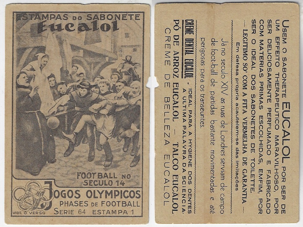 | 66025 | Brasil, 1930s, estampa Eucalol série 64, estampa 1, "Jogos Olímpicos - Fases do Futebol", verso "Usem..." | 20,00 | Foto |