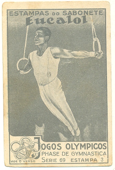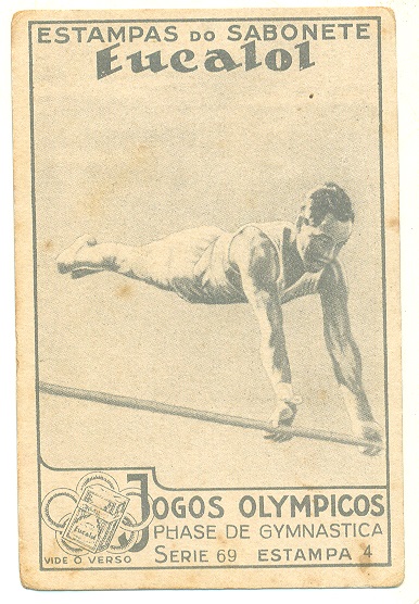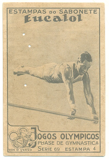 | 66194 | Brasil, 1930s, estampa Eucalol série 69, estampa 4, "Jogos Olímpicos - Fases da Ginástica", verso "Usem...", 3 furos de cupim | 15,00 | Foto |