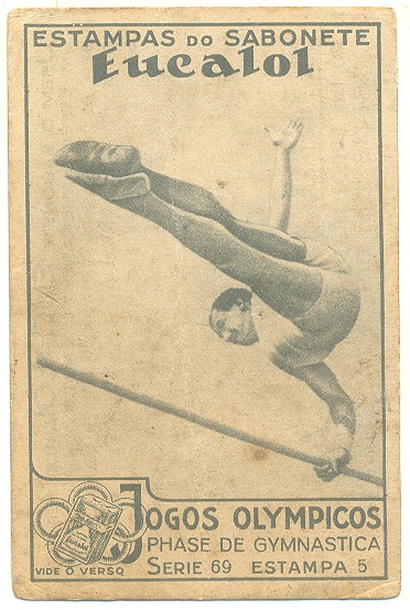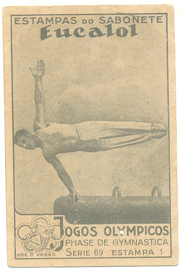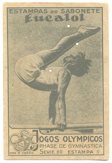 | 66195 | Brasil, 1930s, estampa Eucalol série 69, estampa 6, "Jogos Olímpicos - Fases da Ginástica", verso "Usem...", 3 furos de cupim | 15,00 | Foto |