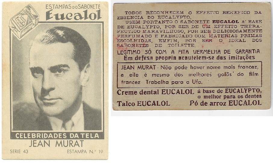 | 66064 | Brasil, 1930s, estampa Eucalol série 43, estampa 19, "Celebridades da Tela - Jean Murat", verso "Todos..." | 25,00 | Foto |
