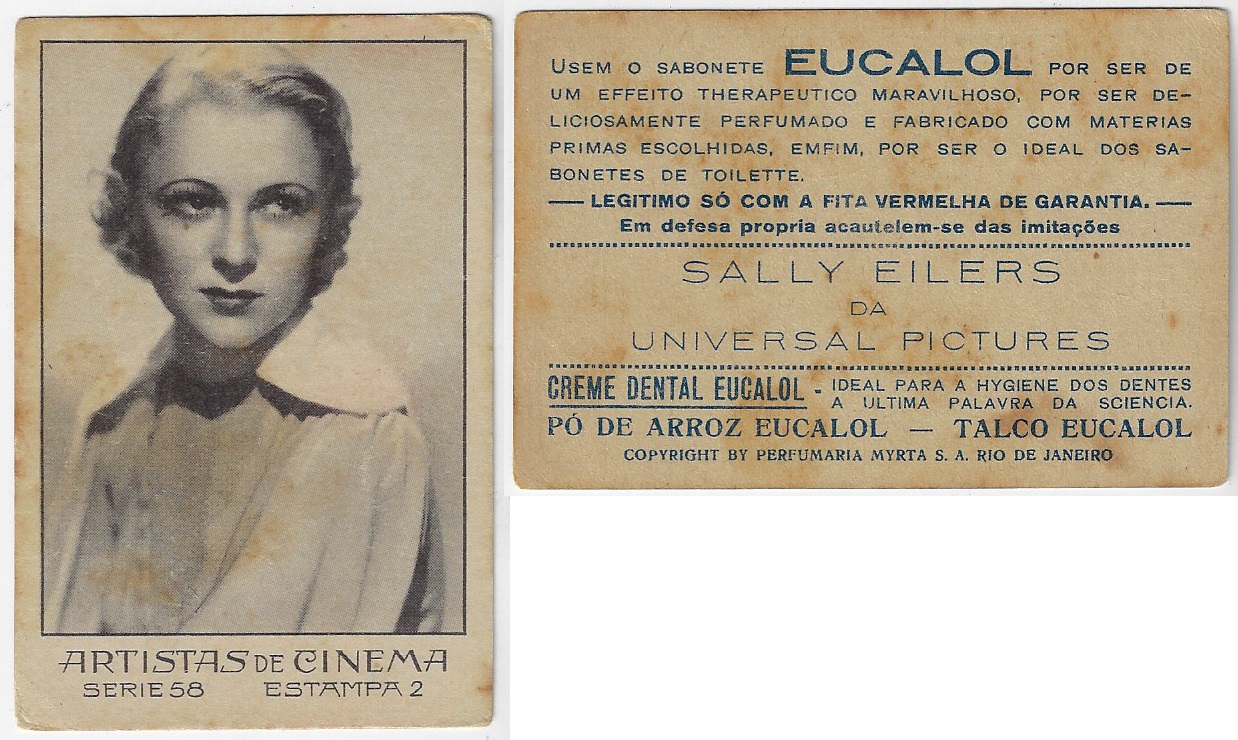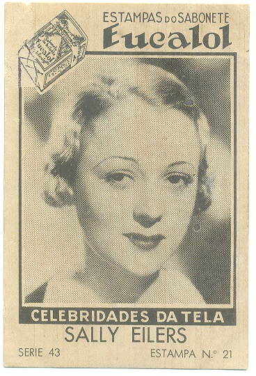 | 66081 | Brasil, 1930s, estampa Eucalol série 43, estampa 21, "Celebridades da Tela - Sally Eilers", verso "Todos...", 2 furos de cupim fechados | 15,00 | Foto |