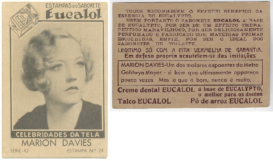 | 66084 | Brasil, 1930s, estampa Eucalol série 43, estampa 24, "Celebridades da Tela - Marion Davies", verso "Todos..." | 25,00 | Foto |