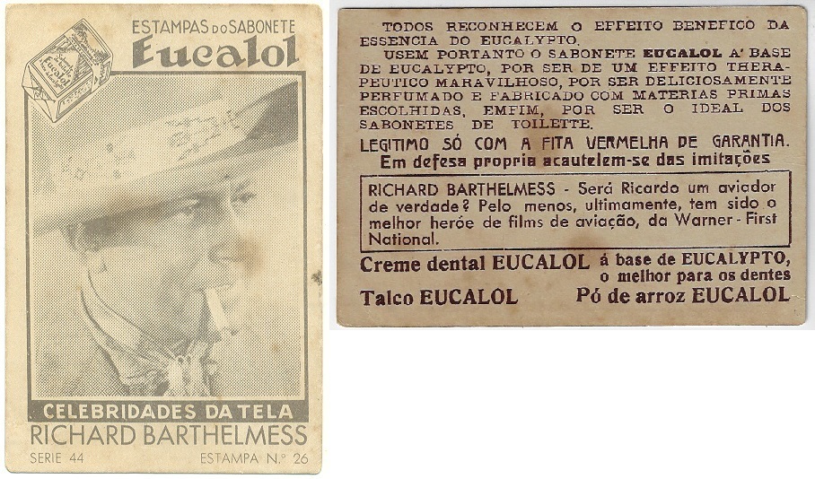 | 66086 | Brasil, 1930s, estampa Eucalol série 44, estampa 26, "Celebridades da Tela - Richard Barthelmess", verso "Todos..." | 25,00 | Foto |