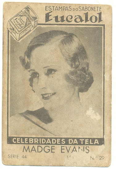 | 66089 | Brasil, 1930s, estampa Eucalol série 44, estampa 29, "Celebridades da Tela - Madge Evans", verso "Todos...", raspado frontal | 15,00 | Foto |