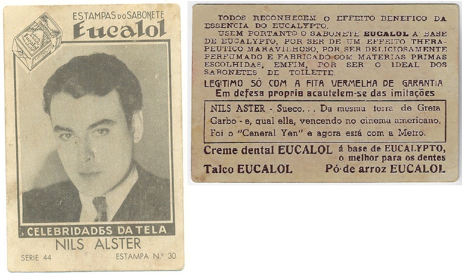 | 66090 | Brasil, 1930s, estampa Eucalol série 44, estampa 30, "Celebridades da Tela - Nils Alster", verso "Todos..." | 25,00 | Foto |