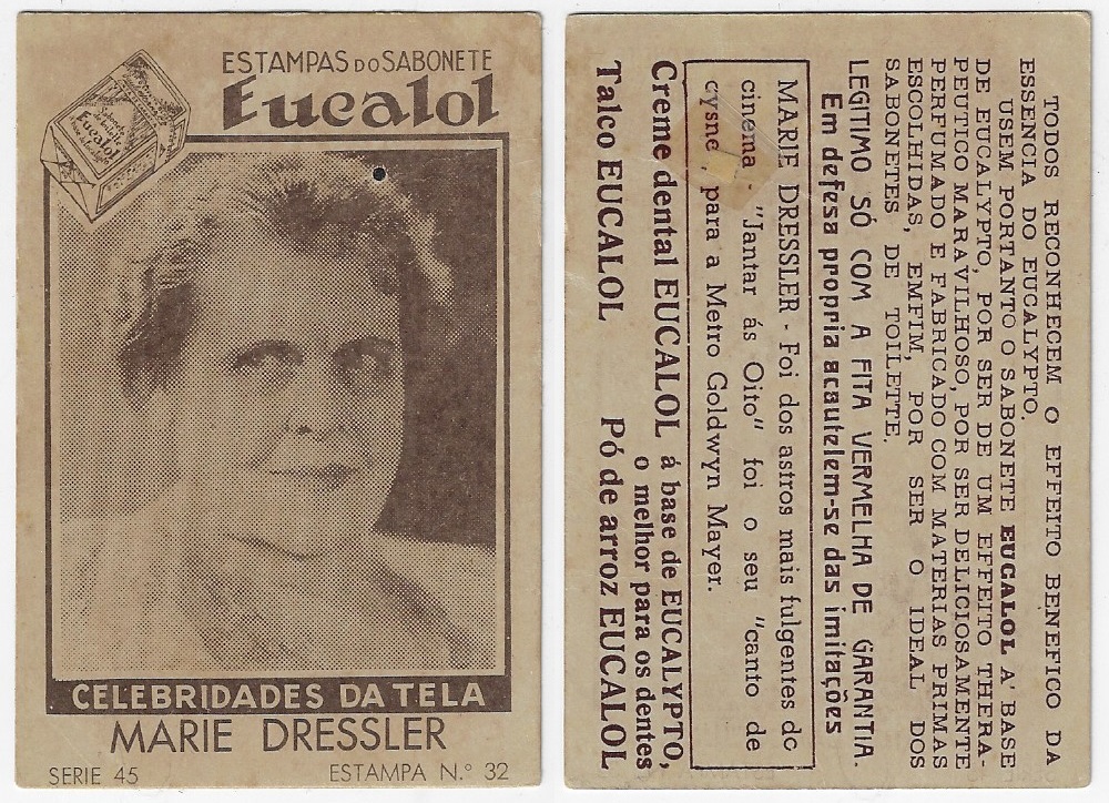 | 66092 | Brasil, 1930s, estampa Eucalol série 45, estampa 32, "Celebridades da Tela - Marie Dressler", verso "Todos...", furo de cupim fechado | 15,00 | Foto |