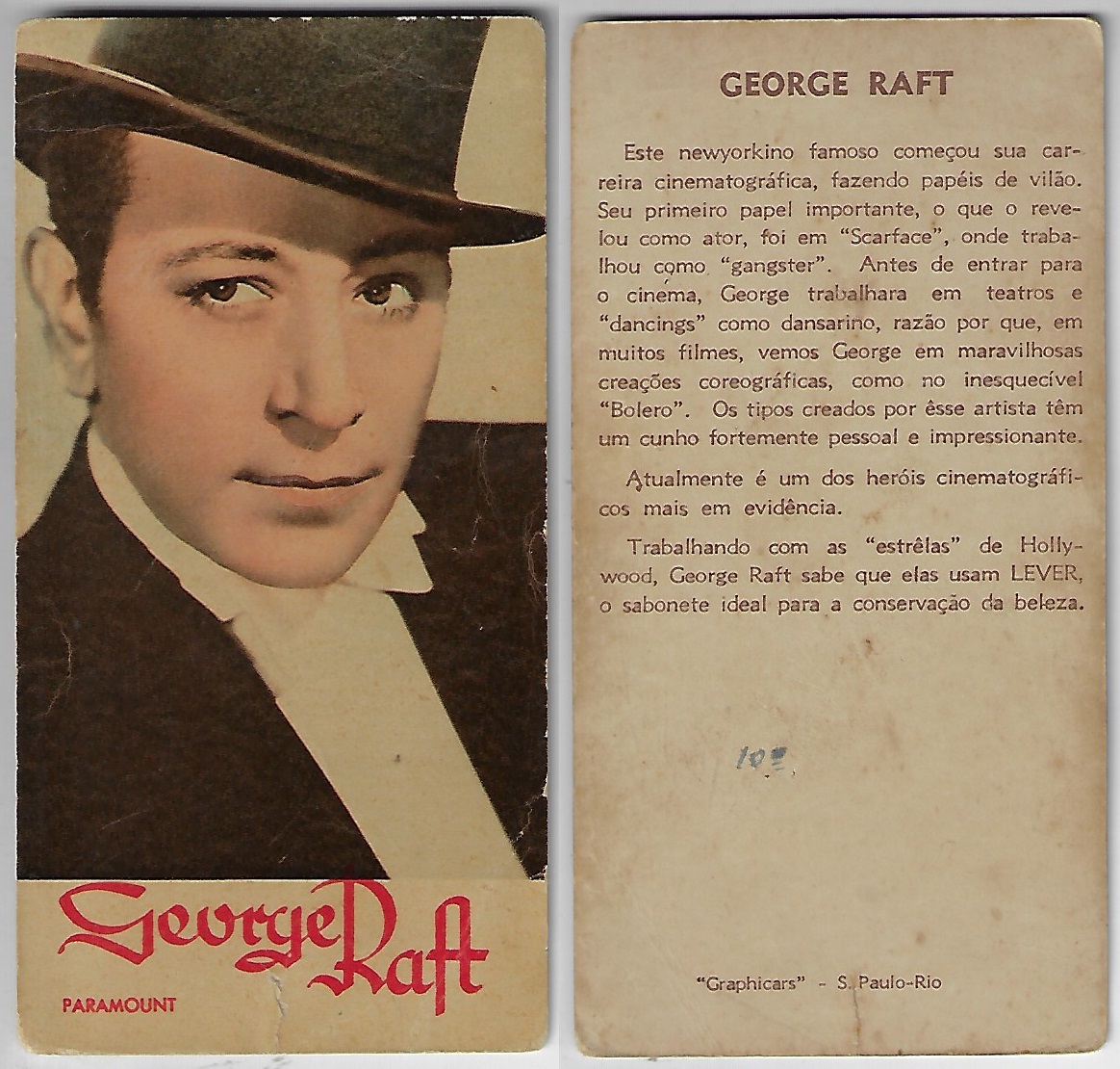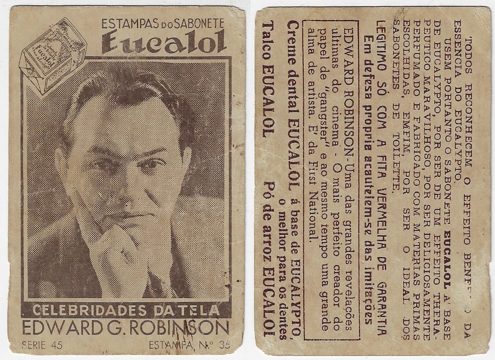 | 66095 | Brasil, 1930s, estampa Eucalol série 45, estampa 35, "Celebridades da Tela - Edward G. Robinson", verso "Todos...", desgaste nas bordas | 20,00 | Foto |