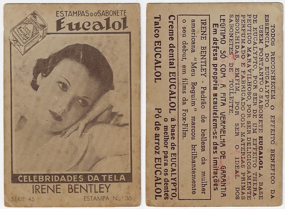 | 66096 | Brasil, 1930s, estampa Eucalol série 45, estampa 36, "Celebridades da Tela - Irene Bentley", verso "Todos..." | 25,00 | Foto |