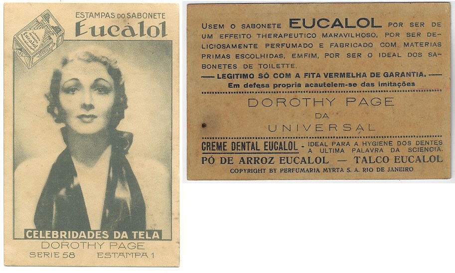 | 66097 | Brasil, 1930s, estampa Eucalol série 58, estampa 1, "Celebridades da Tela - Dorothy Page", verso "Usem..." | 25,00 | Foto |