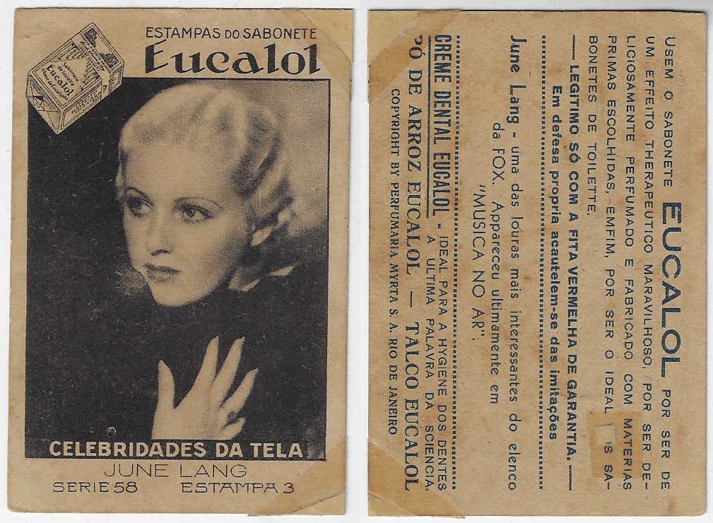 | 66099 | Brasil, 1930s, estampa Eucalol série 58, estampa 3, "Celebridades da Tela - June Lang", verso "Usem...", furo de cupim fechado e 2 cantos restaurados | 15,00 | Foto |