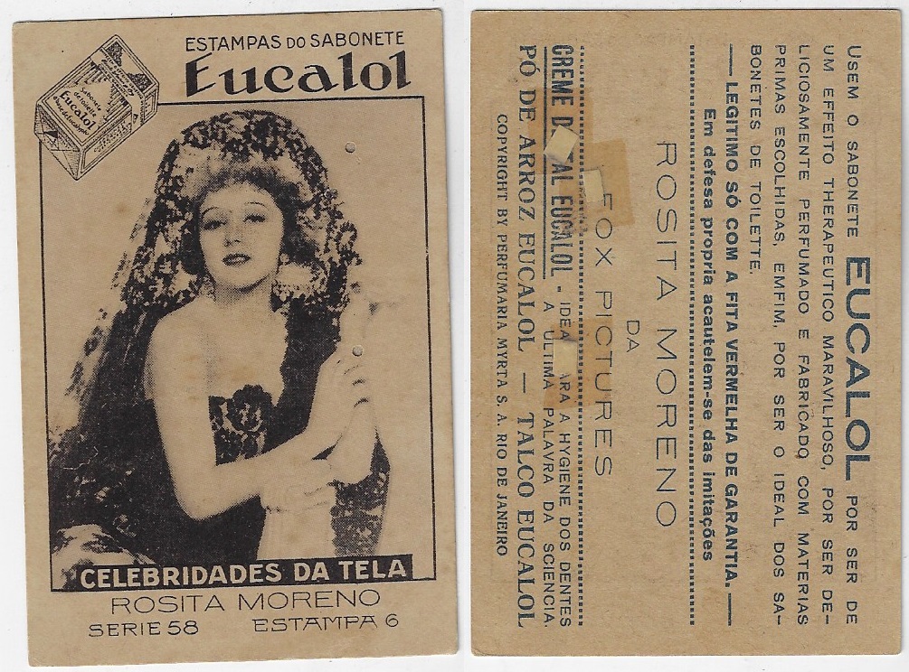 | 66102 | Brasil, 1930s, estampa Eucalol série 58, estampa 6, "Celebridades da Tela - Rosita Moreno", verso "Usem...", 3 furos de cupim fechados | 15,00 | Foto |