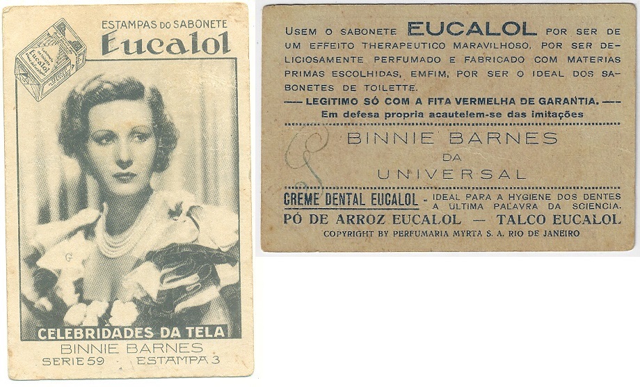 | 66104 | Brasil, 1930s, estampa Eucalol série 59, estampa 3, "Celebridades da Tela - Binnie Barnes", verso "Usem..." | 25,00 | Foto |