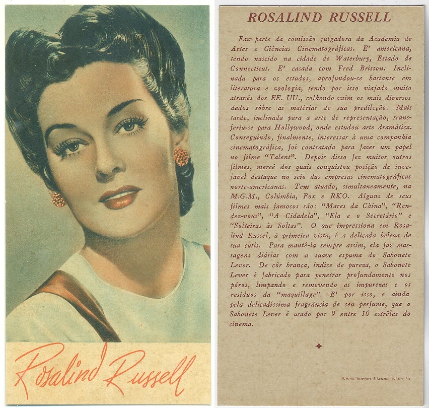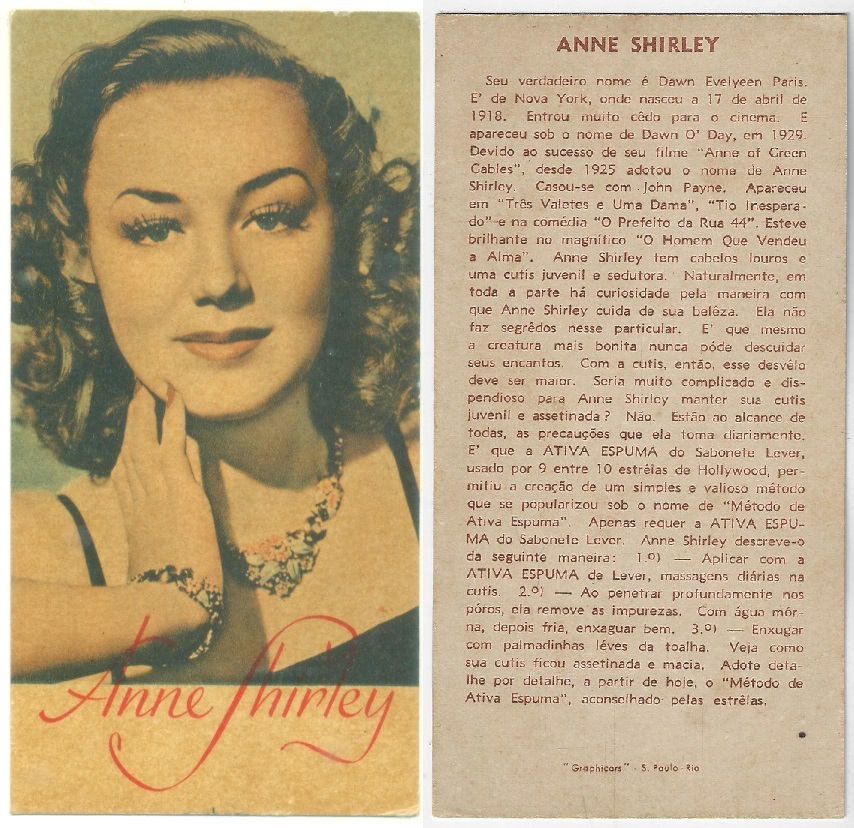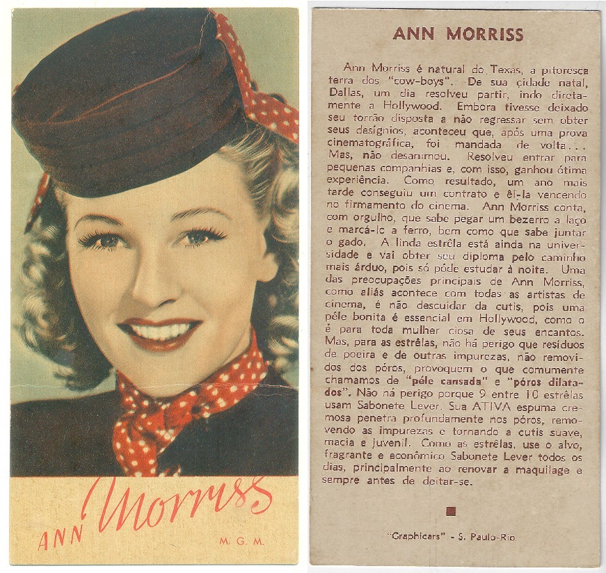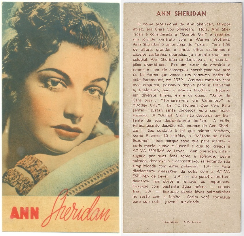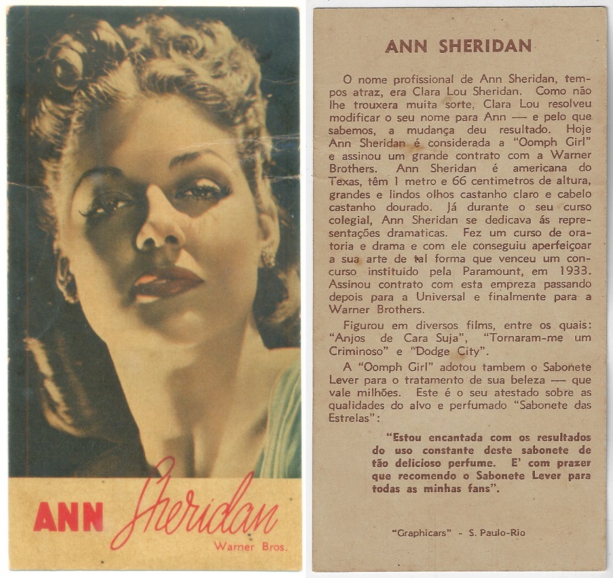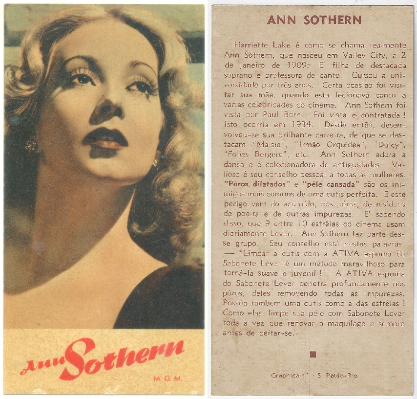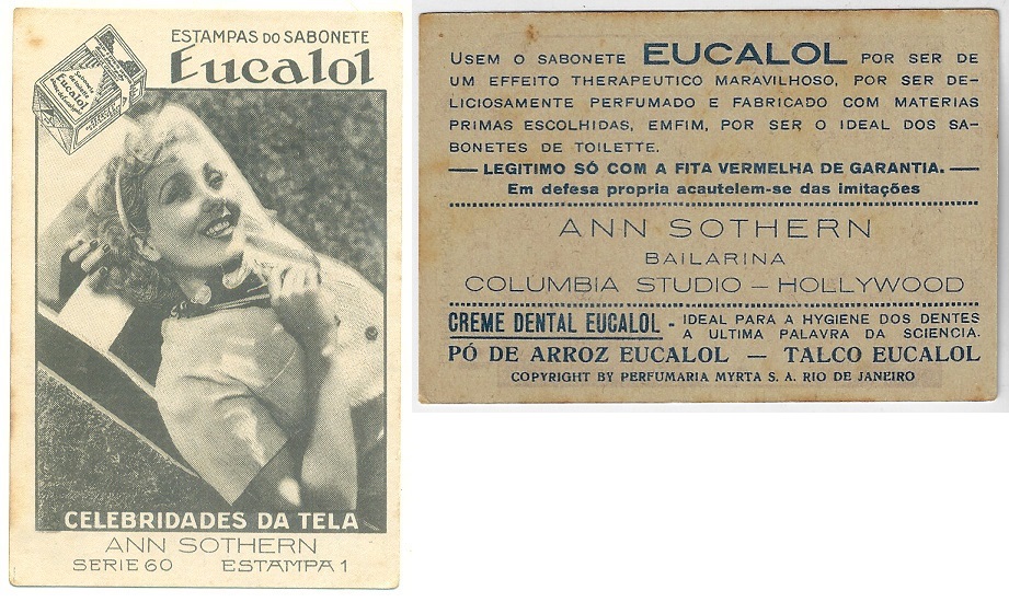 | 66108 | Brasil, 1930s, estampa Eucalol série 60, estampa 1, "Celebridades da Tela - Ann Sothern", verso "Usem..." | 25,00 | Foto |