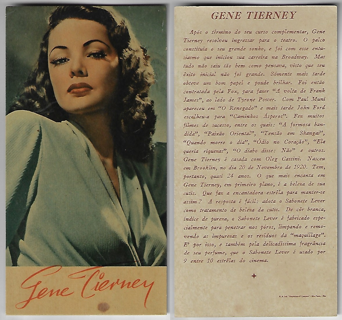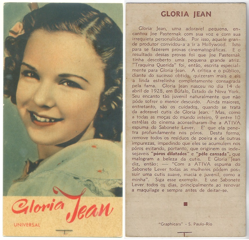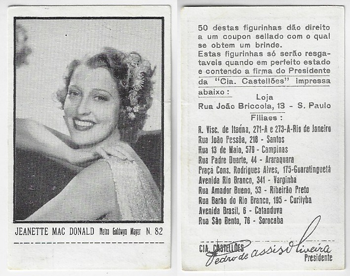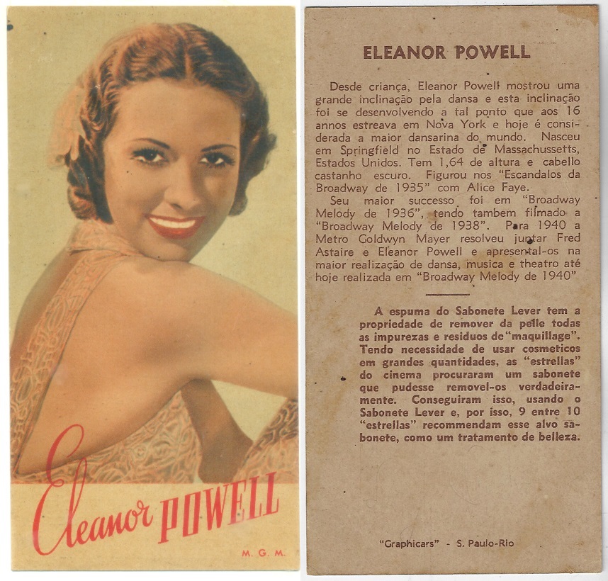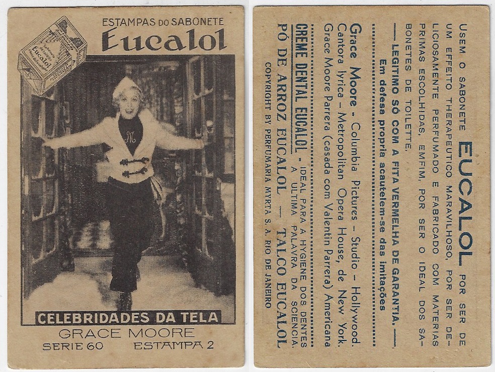 | 66109 | Brasil, 1930s, estampa Eucalol série 60, estampa 2, "Celebridades da Tela - Grace Moore", verso "Usem..." | 25,00 | Foto |