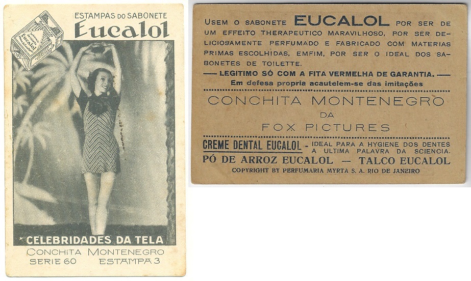 | 66167 | Brasil, 1930s, estampa Eucalol série 60, estampa 3, "Artistas de Cinema - Conchita Montenegro", verso "Usem...", 2 furos de cupim fechados | 15,00 | Foto |