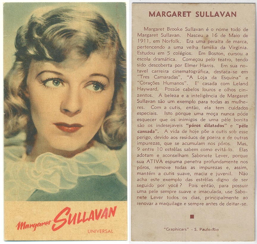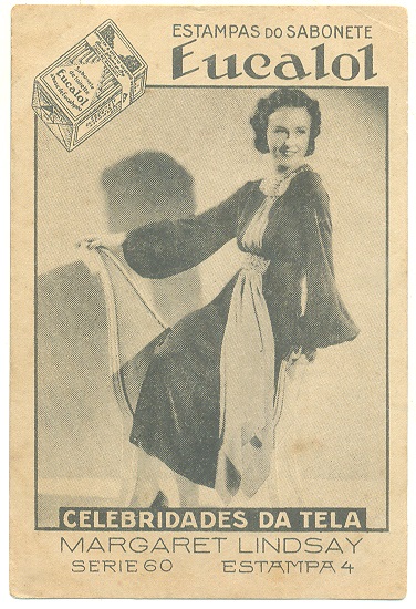 | 66111 | Brasil, 1930s, estampa Eucalol série 60, estampa 4, "Celebridades da Tela - Margarete Lindsay", verso "Usem...", defeitos no verso | 15,00 | Foto |