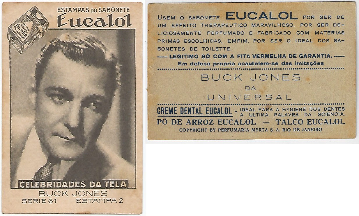 | 66115 | Brasil, 1930s, estampa Eucalol série 61, estampa 2, "Celebridades da Tela - Buck Jones", verso "Usem..." | 25,00 | Foto |