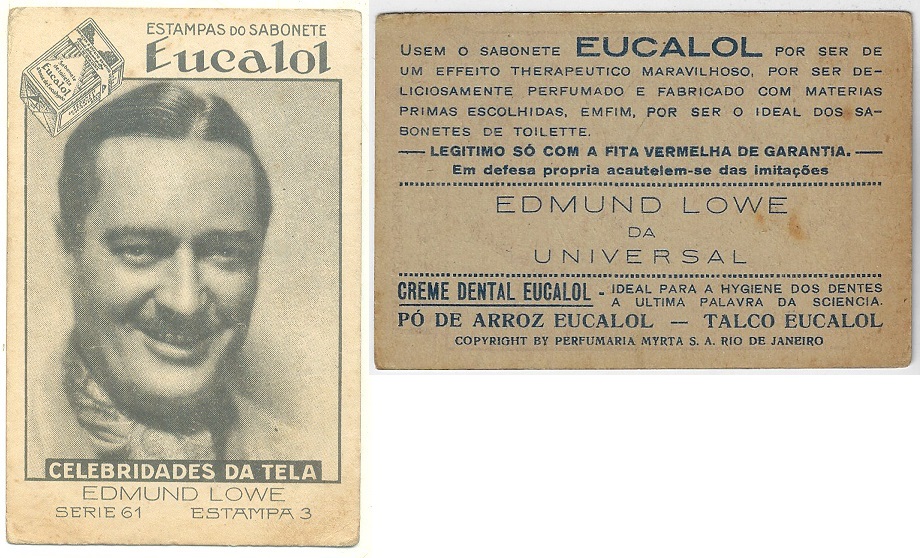 | 66116 | Brasil, 1930s, estampa Eucalol série 61, estampa 3, "Celebridades da Tela - Edmund Lowe", verso "Usem..." | 25,00 | Foto |