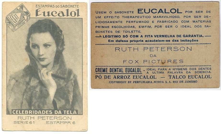 | 66119 | Brasil, 1930s, estampa Eucalol série 61, estampa 6, "Celebridades da Tela - Ruth Peterson", verso "Usem..." | 25,00 | Foto |
