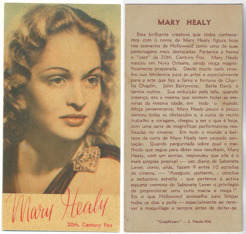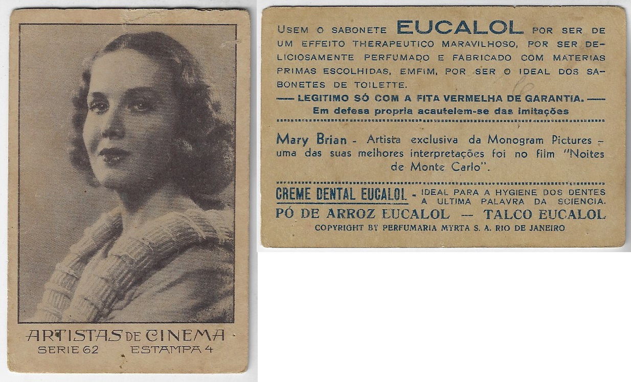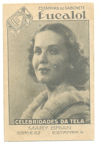 | 66123 | Brasil, 1930s, estampa Eucalol série 62, estampa 4, "Celebridades da Tela - Mary Brian", verso "Usem...", 3 furos de cupim fechados | 15,00 | Foto |