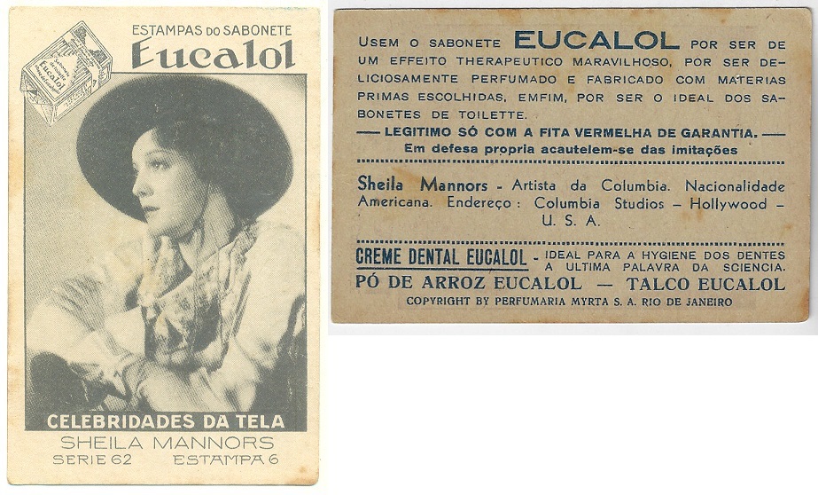 | 66125 | Brasil, 1930s, estampa Eucalol série 62, estampa 6, "Celebridades da Tela - Sheila Mannors", verso "Usem..." | 25,00 | Foto |