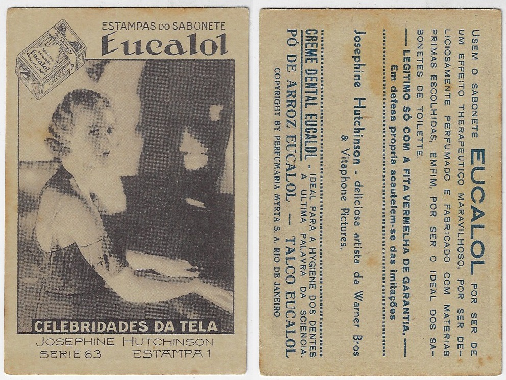 | 66126 | Brasil, 1930s, estampa Eucalol série 63, estampa 1, "Celebridades da Tela - Josephine Hutchinson", verso "Usem..." | 25,00 | Foto |