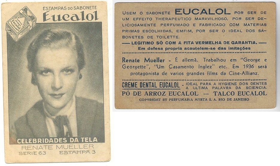 | 66128 | Brasil, 1930s, estampa Eucalol série 63, estampa 3, "Celebridades da Tela - Renate Mueller", verso "Usem..." | 25,00 | Foto |