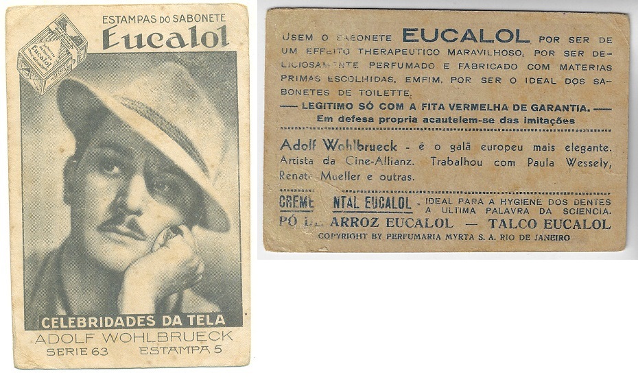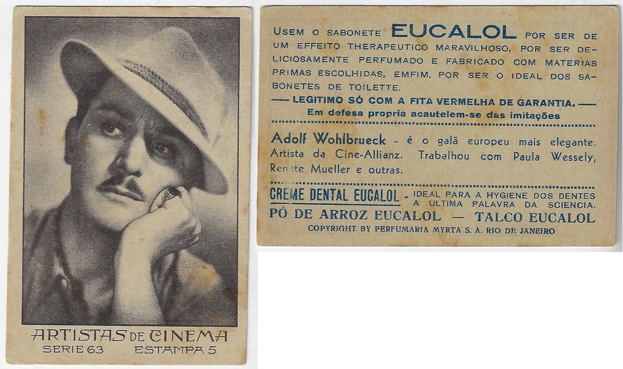| 66130 | Brasil, 1930s, estampa Eucalol série 63, estampa 5, "Celebridades da Tela - Adolf Wohlbrueck", verso "Usem...", pequeno raspado no verso | 25,00 | Foto |