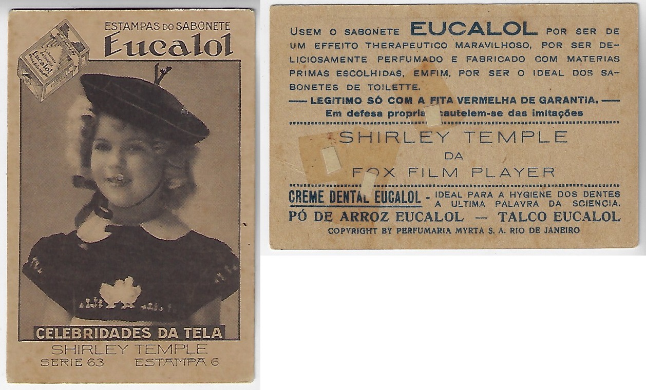 | 66131 | Brasil, 1930s, estampa Eucalol série 63, estampa 6, "Celebridades da Tela - Shirley Temple", verso "Usem...", 3 furos de cupim fechados | 25,00 | Foto |