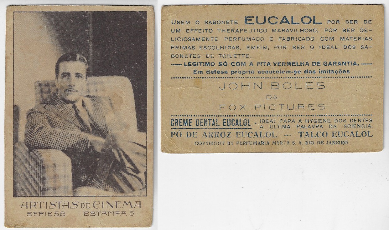 | 66160 | Brasil, 1930s, estampa Eucalol série 58, estampa 5, "Artistas de Cinema - John Boles", verso "Usem..." | 25,00 | Foto |