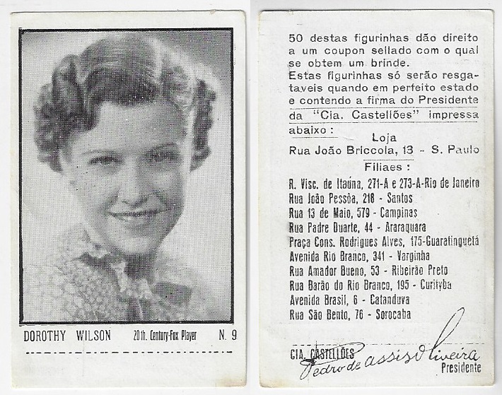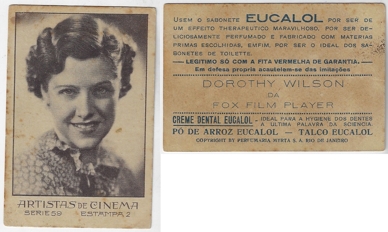 | 66162 | Brasil, 1930s, estampa Eucalol série 59, estampa 2, "Artistas de Cinema - Dorothy Wilson", verso "Usem..." | 25,00 | Foto |