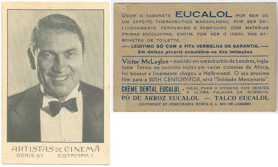 | 66170 | Brasil, 1930s, estampa Eucalol série 61, estampa 1, "Artistas de Cinema - Victor McLaglen", verso "Usem...", pequeno vestígio de cola no canto no verso | 25,00 | Foto |