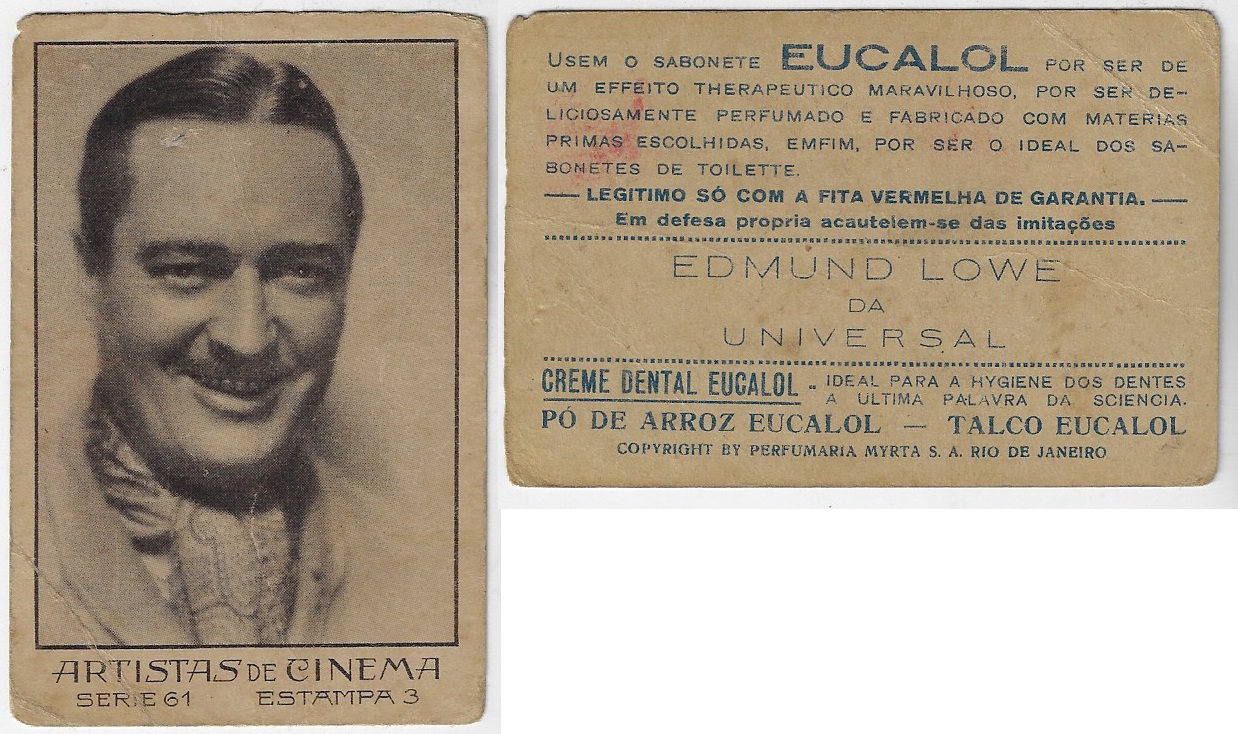 | 66172 | Brasil, 1930s, estampa Eucalol série 61, estampa 3, "Artistas de Cinema - Edmund Lowe", verso "Usem...", dobra de canto | 25,00 | Foto |