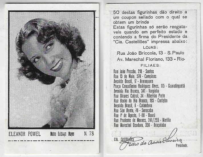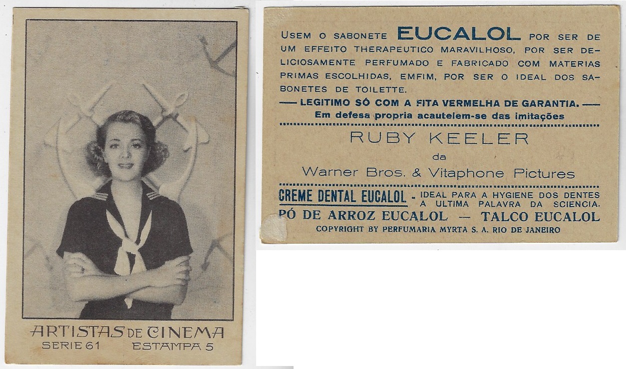 | 66174 | Brasil, 1930s, estampa Eucalol série 61, estampa 5, "Artistas de Cinema - Ruby Keeler", verso "Usem...", pequenas marcas de cola no verso | 25,00 | Foto |