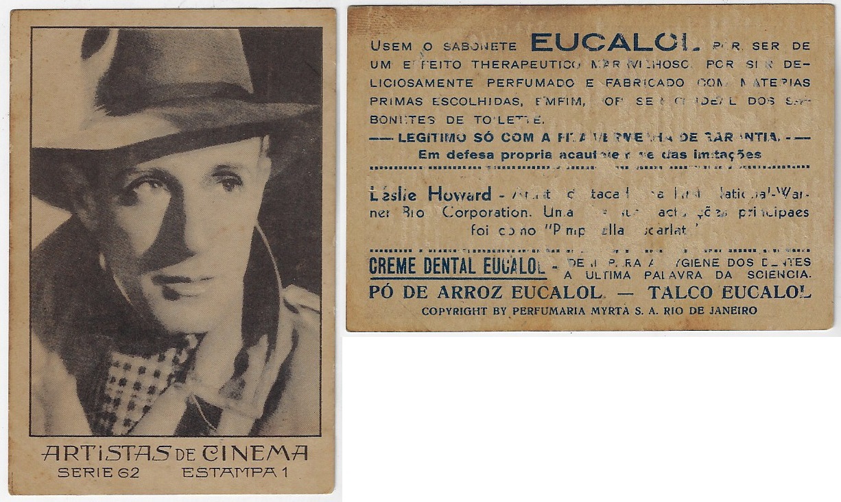 | 66175 | Brasil, 1930s, estampa Eucalol série 62, estampa 1, "Artistas de Cinema - Leslie Howard", verso "Usem...", desgaste no verso | 25,00 | Foto |