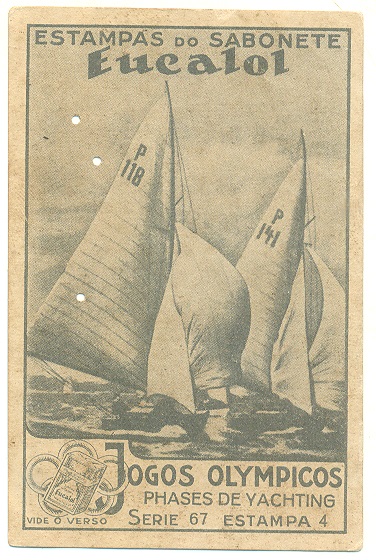 | 66192 | Brasil, 1930s, estampa Eucalol série 67, estampa 4, "Jogos Olímpicos - Fases do Iatismo", verso "Usem...", 3 furos de cupim | 15,00 | Foto |