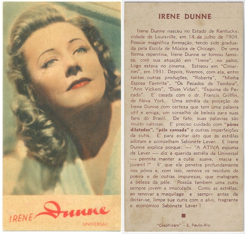 | 66169 | Brasil, 1930s, estampa Eucalol série 60, estampa 6, "Artistas de Cinema - Irene Dunne", verso "Usem...", dobras | 15,00 | Foto |