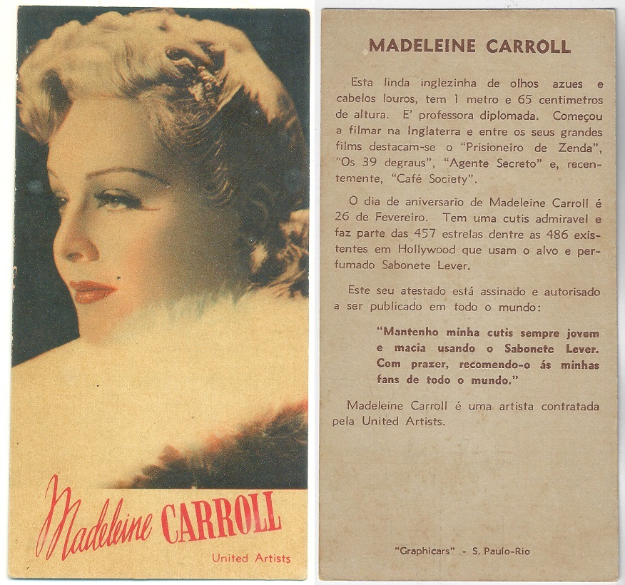 | 66058 | Brasil, 1930s, estampa Eucalol série 35, estampa 2, "Celebridades da Tela - Carole Lombard", verso "Todos...", dobra | 15,00 | Foto |