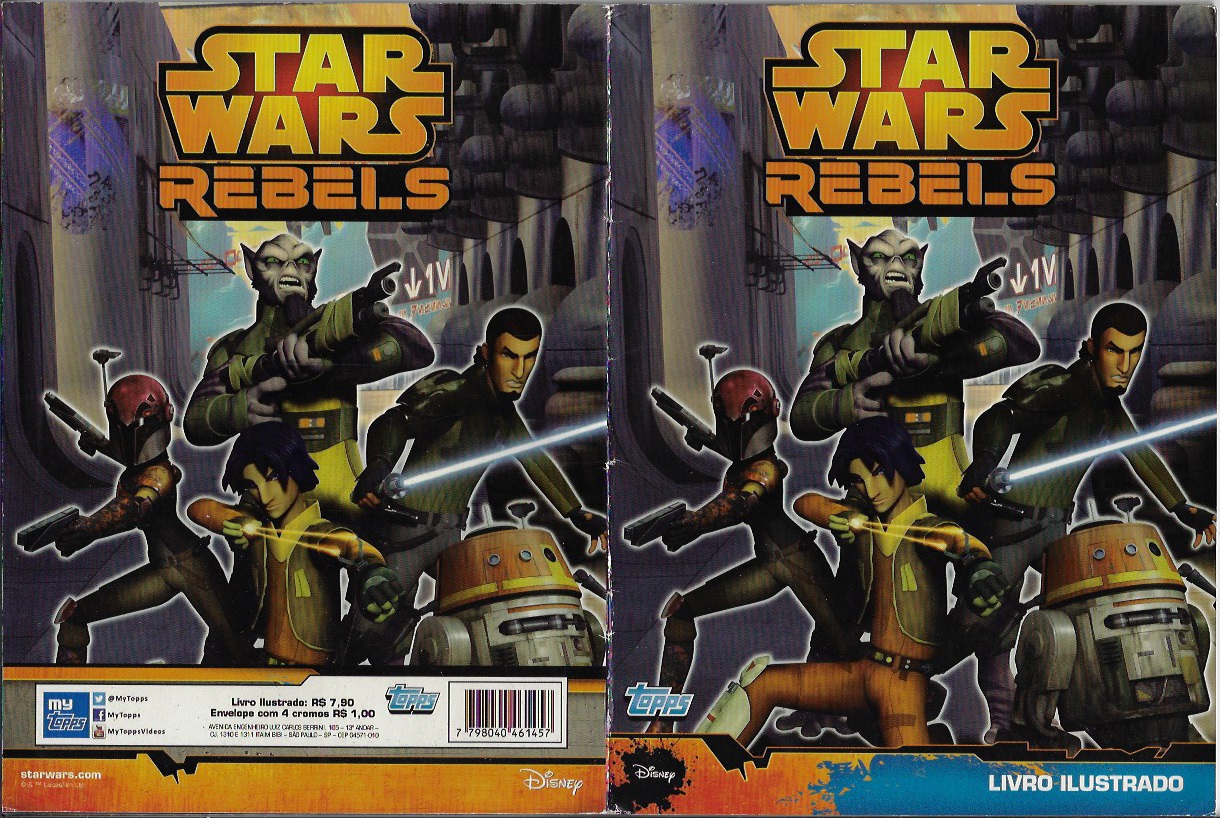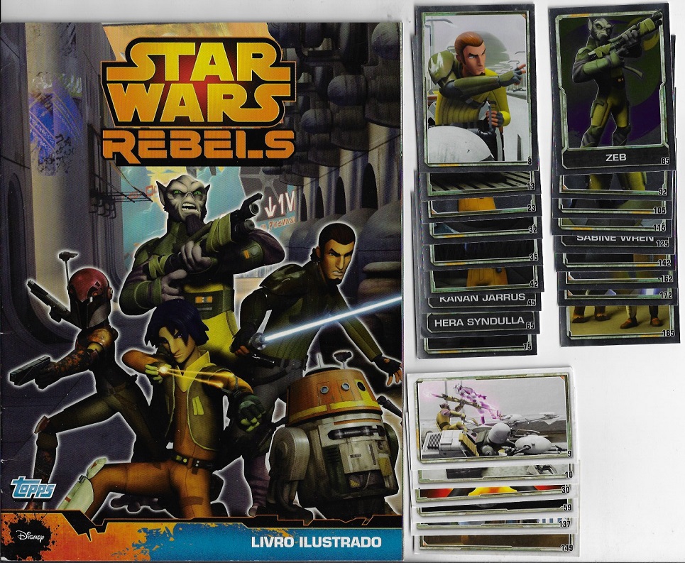 | 79255 | Brasil, 2015, álbum de figurinhas "Star Wars Rebels", Editora Topps, vazio + 24 figurinhas soltas diferentes, sendo 18 metalizadas | 15,00 | Foto |